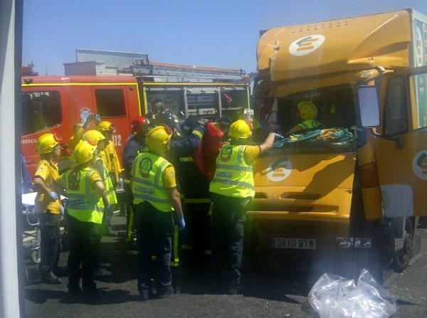 La colisión con la parte trasera del autobús ha provocado que la parte delantera del camión atrapará al copiloto por las piernas sin que pudiera salir. Los bomberos han necesitado 40 minutos para sacarle del vehículo.