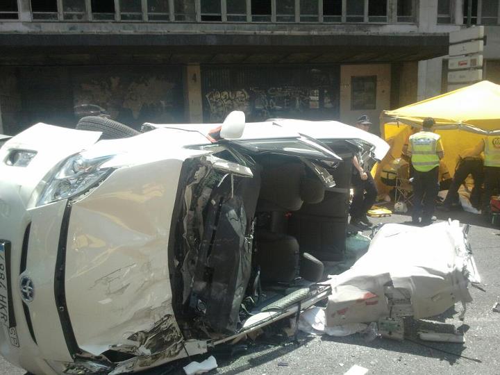 Como consecuencia del múltiple impacto de los vehículos, el taxi ha quedado semivolcado sobre su parte izquierda. Su conductor, un hombre de 45 años, ha quedado atrapado entre el volante y los pedales. Además, los dos clientes que transportaba en la parte de atrás, un hombre de 39 y una mujer peruana de 38, también han quedado atrapados en el interior del mismo.