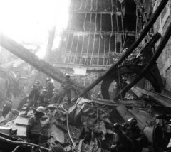 Pero lo peor aún estaba por llegar. En torno a las tres de la mañana, cuando las llamas se habían sofocado, uno de los sótanos se vino abajo llevándose consigo el resto del edificio con los bomberos dentro de él. No había tiempo, los escombros debían ser retirados lo antes posible o la probabilidad de que hubiese supervivientes era mínima. Sin maquinaria al principio y con una cinta transportadora al final, la cadena humana retiraba fragmentos del edificio.