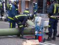Los bomberos han sujetado la estructura metálica con una grúa de gran tonelaje, mientras cortaban mediante soplete los postes que lo sujetaban. Una vez que lo bajaron al suelo, lo trocearon y lo retiraron de la vía.