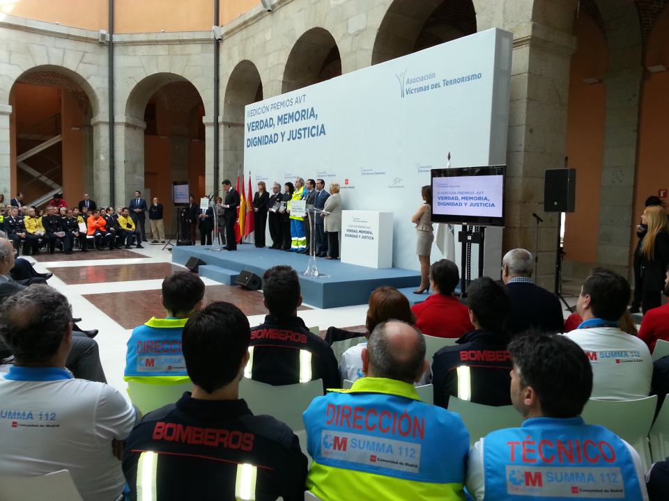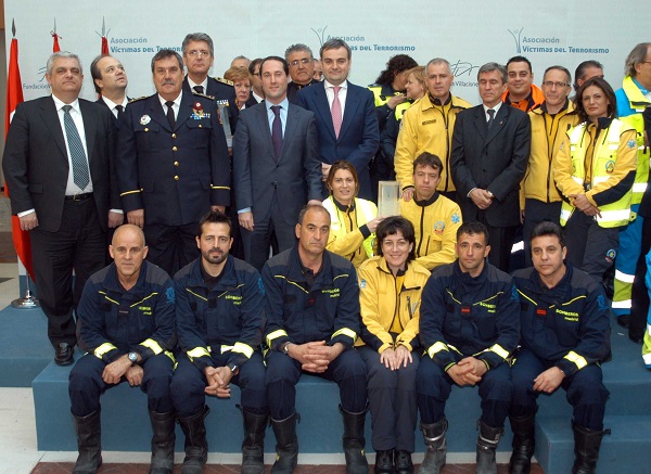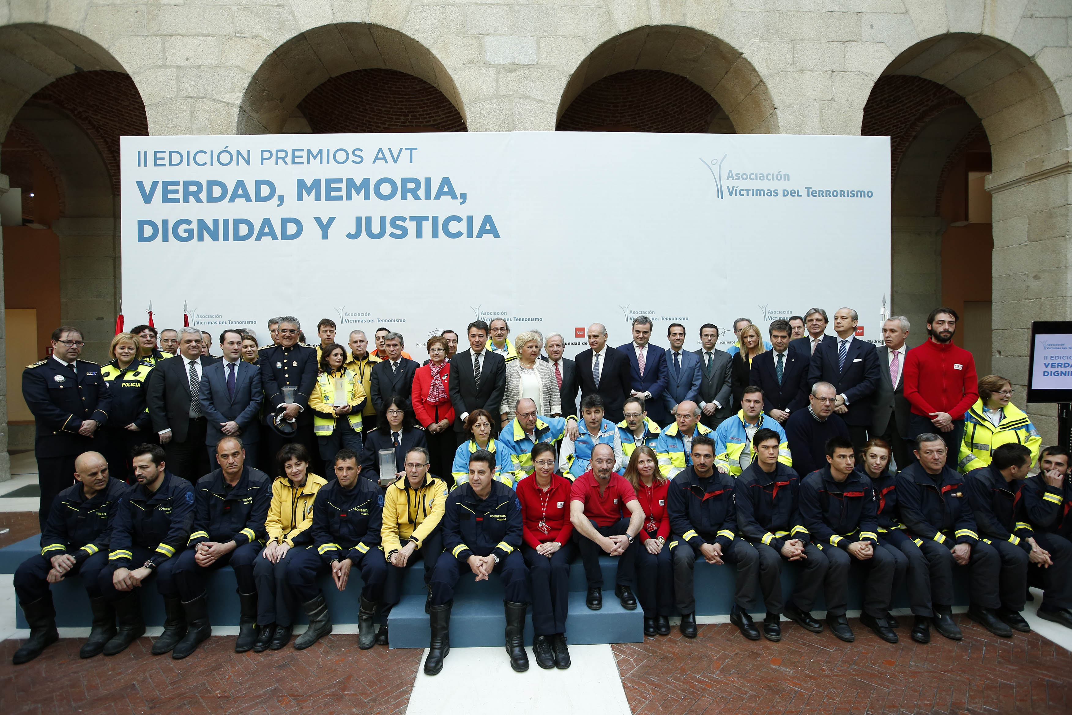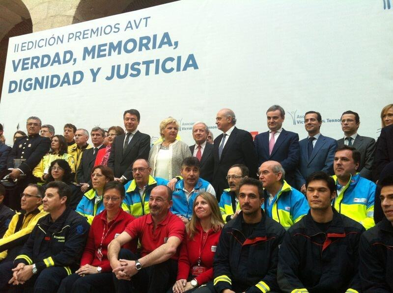 La Asociación de Víctimas del Terrorismo ha concedido este martes su premio ‘Verdad, Memoria, Dignidad y Justicia’, en su segunda edición, al trabajo y entrega de los servicios de Emergencias tanto de la Comunidad de Madrid como del Ayuntamiento de la capital con el fin de ensalzar su labor en la lucha contra el terrorismo. La presidenta de la asociación, María Ángeles Pedraza, acompañada del ministro de Interior, Jorge Fernández Díaz; el presidente de la Comunidad, Ignacio González; o el delegado de Seguridad y Emergencias del Consistorio madrileño, Enrique Núñez, entre otros, ha sido la encargada de dirigir este acto en la Real Casa de Correos, que ha comenzado con un minuto de silencio por todas las víctimas.