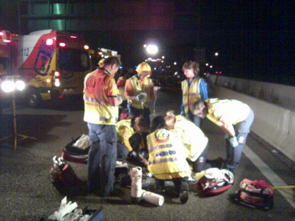 Cuando los facultativos de Samur-Protección Civil llegaron al lugar de los hechos, los dos ocupantes del Opel Vectra estaban fuera del vehículo, del que habían salido por sus propios medios y con ayuda de testigos del accidente que pararon a ayudar. Uno de los hombres, un varón de unos 35 años, presentaba quemaduras de 2º y 3º grado en brazo derecho, ambas piernas y torax, además de un traumatismo torácico y otro abdominal. Entró en parada cardiorrespiratoria.