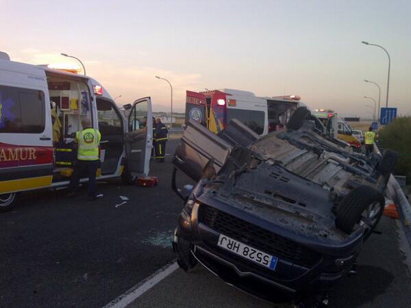 Un accidente de tráfico a la altura de la Terminal 4 de Barajas, donde la M-13 se incorpora a la M-12, ha provocado una herida de carácter muy grave, un herido de carácter grave y otros cuatro de carácter leve. Sobre las 19.40 horas, un taxi ha golpeado por detrás a un monovolumen Citröen Xsara Picasso, que ha dado varias vueltas de campana y ha quedado boca abajo en el lateral de la autopista.