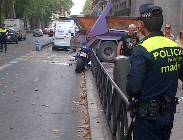 Un motorista de unos 25 años de edad ha resultado este viernes herido grave tras chocar, cuando circulaba por el lateral del Paseo del Prado a la altura de la calle Los Madrazo, con un camión que transportaba escombros. El suceso ha tenido lugar sobre las 13.30 horas, cuando el camión volquete de transporte de escombros ha girado a la derecha hacia la calle Los Madrazo.