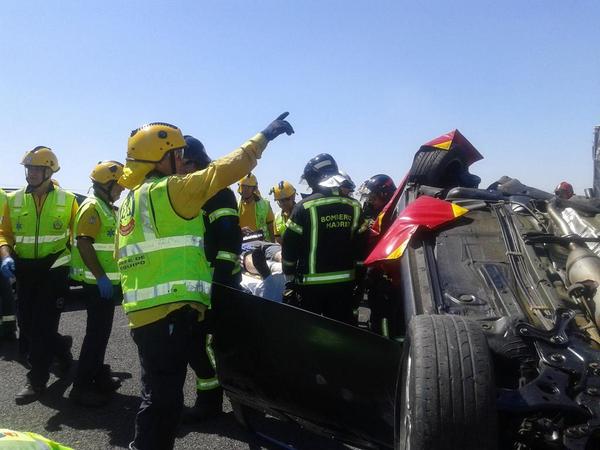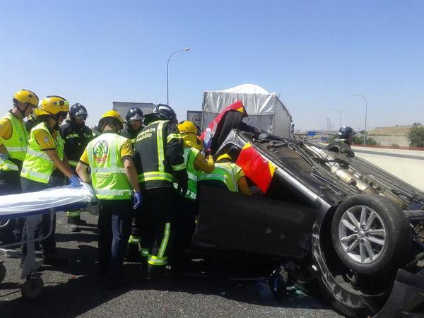 Por el impacto, el turismo se ha desplazado varios metros hasta quedar volcado en la carretera. Dentro ha quedado atrapado el conductor, el único ocupante del vehículo. Ha tenido que ser rescatado por bomberos del Ayuntamiento de Madrid, que han tenido que utilizar material hidráulico para su rescate, unas tareas que se han prolongado durante media hora.