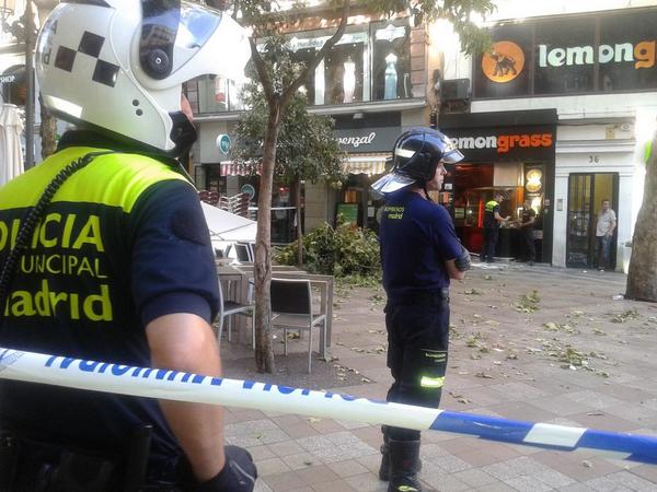 Una rama de un árbol ha caído sobre una terraza de la calle Montera y ha provocado cuatro heridos leves. Los afectados han sido tres varones. El primero, de 42 años de edad, con heridas en la rodilla; otro de 82 años, herido levemente en la mano y en la cabeza; y el último de 53 años, también con herida en la cabeza.