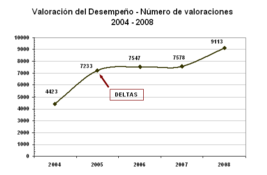 La calidad asistencial es un objetivo prioritario, hasta el punto de que el desarrollo organizativo del Servicio ha ido, desde sus inicios, parejo al desarrollo de un Sistema de Valoración del Desempeño propio «in situ», el cual genera un proceso permanente de evaluación y análisis de la asistencias y de sus resultados. Las dos figuras que vertebran el sistema de manera permanente son el Médico Jefe de Guardia y los equipos Delta, compuestos por un Diplomado en Enfermería y un Técnico de Emergencias con amplia experiencia reconocida en el Servicio. Los equipos Delta, comenzaron a realizar valoración del desempeño de enfermeros y técnicos en enero de 2005 y esto supuso un importante incremento de esta actividad (puede apreciarse en el gráfico adjunto) ya que con anterioridad era solamente responsabilidad de los Médicos Jefes de Guardia. Su herramienta fundamental de trabajo son los Criterios de Valoración Asistencial, refrendados por la Comisión Deontológica de la Organización Médica Colegial en el año 2004. La función primordial de estos profesionales es la de apoyo al equipo sanitario, garantizando el cumplimiento de los Procedimientos Asistenciales del Servicio, al mismo tiempo que realizan una valoración del desempeño de los intervinientes homólogos. El servicio garantiza su presencia en: