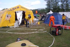 También se sumó a la misión un equipo del Summa112 compuesto por un médico, 4 enfermeras y 2 técnicos y un equipo de DYA compuesto por 2 médicos, 1 enfermero y 2 técnicos. El contingente se instaló en la población de Pasung, provincia de Klaten, a 40 kilómetros de Yogyakarta. En torno a las 14 horas del día 3 llegamos al lugar previsto por la autoridades para el despliegue. Allí acude la población de la zona para recibir todo tipo de ayuda. Incluso se instaló una escuela en tiendas de campaña.