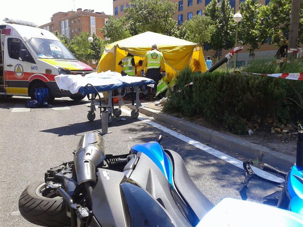 El suceso ha ocurrido hacia las 12.30 horas de este domingo en la confluencia entre la Avenida de la Peseta y la calle Corona. Por causas que se desconocen y que está investigando la Policía Municipal de Madrid, el joven ha perdido el control de su motocicleta y se ha empotrado contra una señal de tráfico y un semáforo.