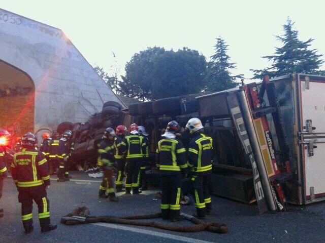 El conductor y único ocupante de un camión volcado en el acceso a la A1 de la carretera M-40 ha fallecido. Cuando los bomberos le han rescatado, los efectivos sanitarios sólo han podido confirmar su muerte.