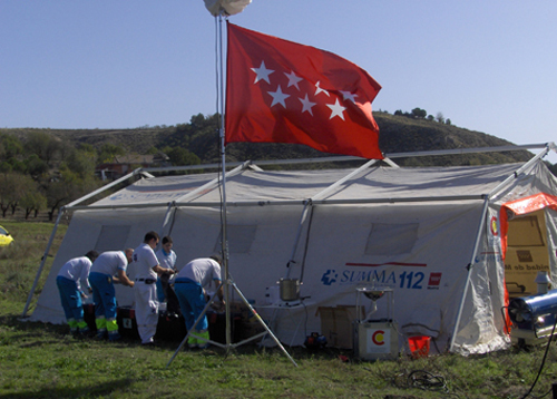 Descripción: estructura modular portátil, ligera, fácil de desplazar y de montaje totalmente mecánico, sin dependencia de dispositivos externos ni de electricidad, preparada para ser usada como puesto médico asistencial, útil para atender víctimas de accidentes, realizar servicios preventivos y ser utilizado por nuestro personal en los desplazamientos al extranjero en las misiones de ayuda internacional como integrantes de la cooperación española.