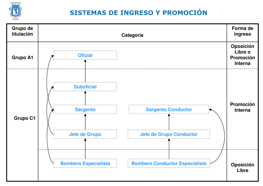 En el siguiente gráfico puedes ver las vías de entrada y promoción en el cuerpo de Bomberos.