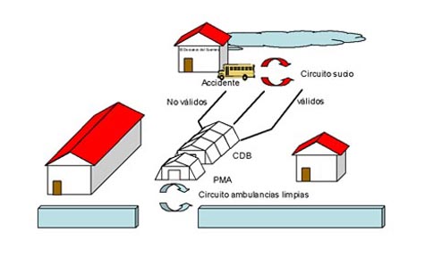 | Los médicos de clasificación colocarán unas etiquetas de clasificación (hay que hacerlas) y los camilleros iniciarán el transporte de afectados. Esto determina que se necesiten 8 camilleros ( mientras dos van y vienen 2 descansan ). Los camilleros son los que más trabajan. | |